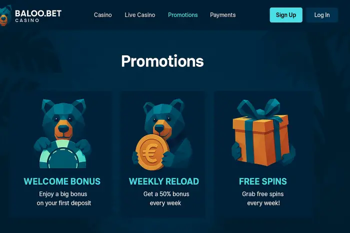 Baloo.bet gebruikt bonussen als onderdeel van de ervaring. Je voelt dat elke promotie bij het thema hoort. Toch blijven de regels helder en kort.