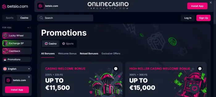 Betsio Casino zet zwaar in op promoties. Je merkt dat direct wanneer je de bonussectie opent. Er zijn meerdere pakketten voor casino spelers en aparte acties voor sport.