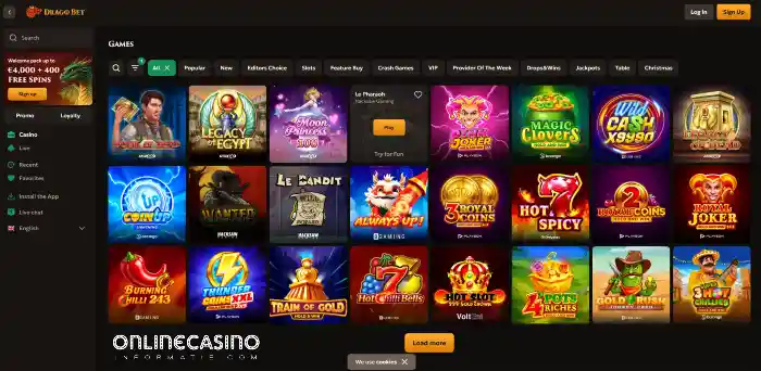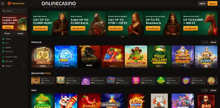 DragoBet Casino is een online casino met een donker design en een rustige lobby. De website is duidelijk opgebouwd en werkt snel. Je navigeert eenvoudig tussen de verschillende spelcategorieën.