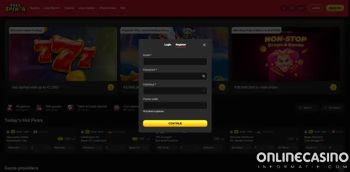 Aanmelden bij Freespinza gaat snel en duidelijk. De registratieknop staat direct zichtbaar op de homepage. Het aanmeldformulier is overzichtelijk opgebouwd. Je vult je basisgegevens in.
