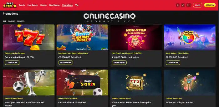 Freespinza heeft een duidelijk opgebouwd bonusprogramma. De focus ligt vooral op casinospellen en sportweddenschappen. Bonussen zijn netjes verdeeld per type. Casino acties en sportacties staan los van elkaar.