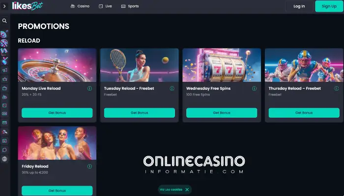 Likes.bet houdt spelers actief met vaste promoties. Deze bonussen komen elke week terug waardoor je altijd iets extra’s hebt wanneer je inlogt.