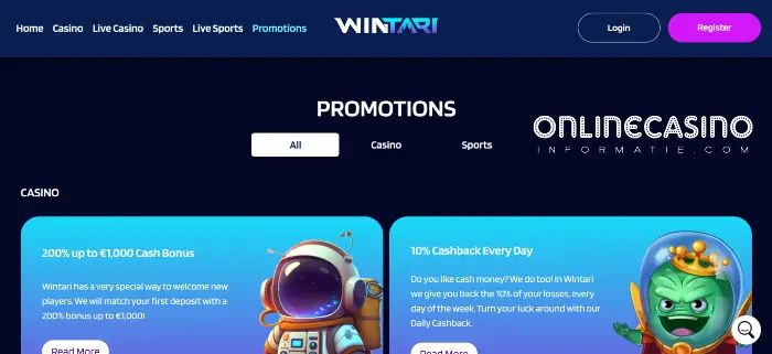 Tijdens mijn analyse viel op dat Wintari duidelijk inzet op bonussen en promoties. De welkomstbonus is opvallend ruim en ook daarna blijven er acties beschikbaar voor vaste spelers.